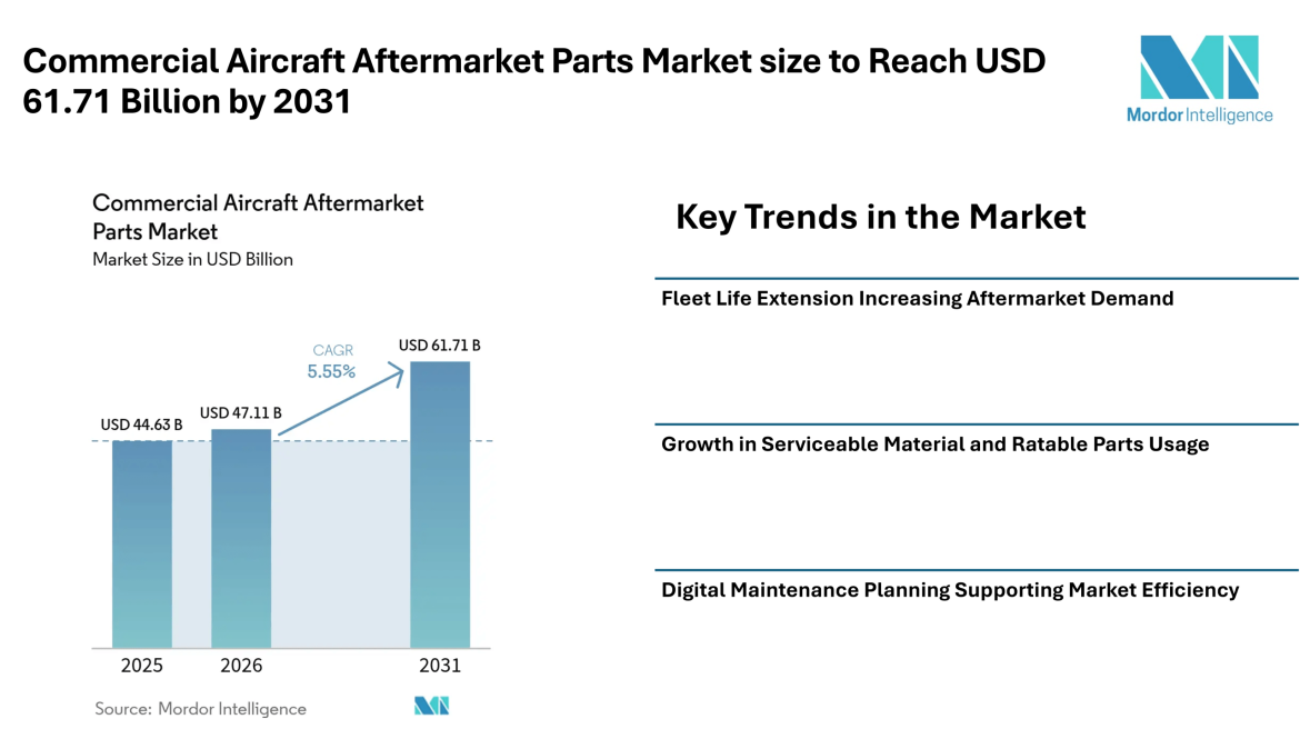 According to Mordor Intelligence, the commercial aircraft aftermarket parts market size is expected to increase from USD 44.63 billion in 2025 to USD 47.11 billion in 2026, with the commercial aircraft aftermarket parts market forecast indicating it will reach USD 61.71 billion by 2031. This steady rise reflects a consistent need for replacement parts, maintenance services, and lifecycle support across global airline fleets.