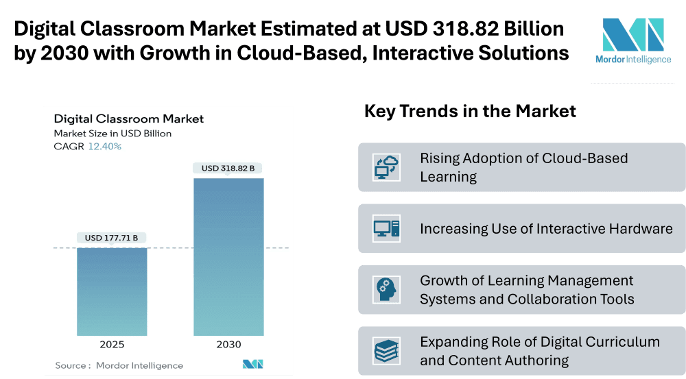 The digital classroom market is gaining momentum as education systems worldwide continue to integrate technology into their teaching and learning processes. According to market insights, the digital classroom market size stood at USD 177.71 billion in 2025 and is projected to reach USD 318.82 billion by 2030, growing at a CAGR of 12.4% during the forecast period. This robust growth reflects how schools, universities, and training organizations are embracing tools that combine convenience, interactivity, and flexibility.