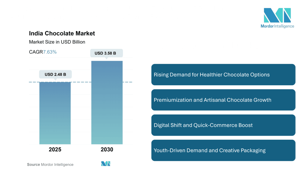 According to a 2025 report on the India Chocolate Market by Mordor Intelligence, the India Chocolate Market Size is projected to grow from USD 2.48 billion in 2025 to USD 3.58 billion by 2030, registering a CAGR of 7.63%. Rising disposable income, evolving consumer preferences, and greater awareness around health and nutrition are reshaping how Indians consume chocolate.