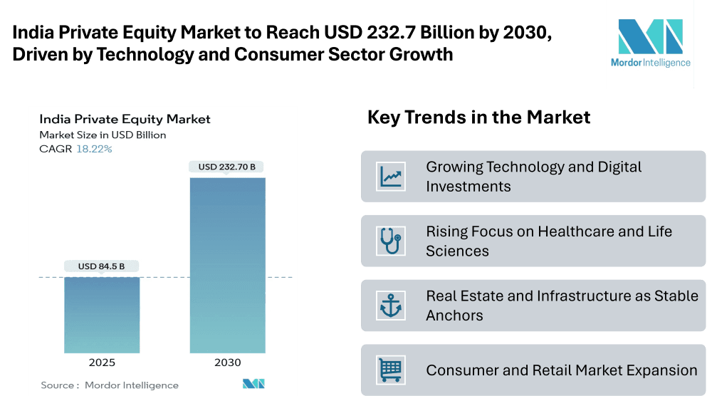 The India private equity market stands at USD 84.5 billion in 2025 and is on track to swell to USD 232.7 billion by 2030, compounding at 18.22% CAGR annually. This expansion reflects the growing role of private equity as a key driver of capital formation, entrepreneurship, and sectoral modernization in the country. Increasing participation from global and domestic investors, combined with favorable demographics and an expanding middle class, has strengthened India’s position as one of the fastest-growing destinations for private equity inflows.