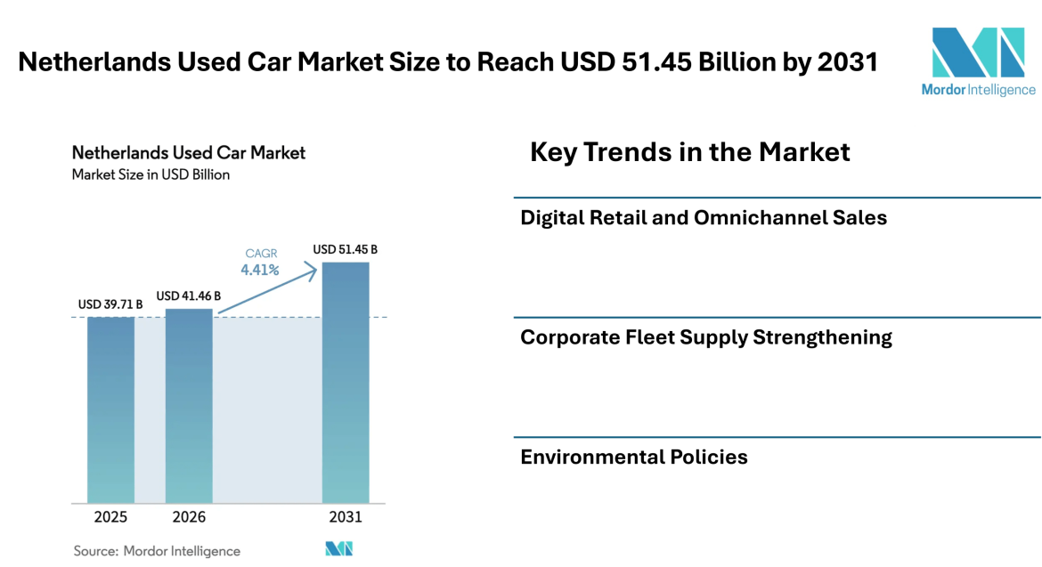 According to Mordor Intelligence, the Netherlands used car market size was valued at USD 39.71 billion in 2025 and is expected to reach USD 41.46 billion in 2026, with projections indicating the market could reach USD 51.45 billion by 2031. This outlook reflects stable demand across passenger vehicle categories and an active resale ecosystem supported by digital platforms and organized dealer networks.
