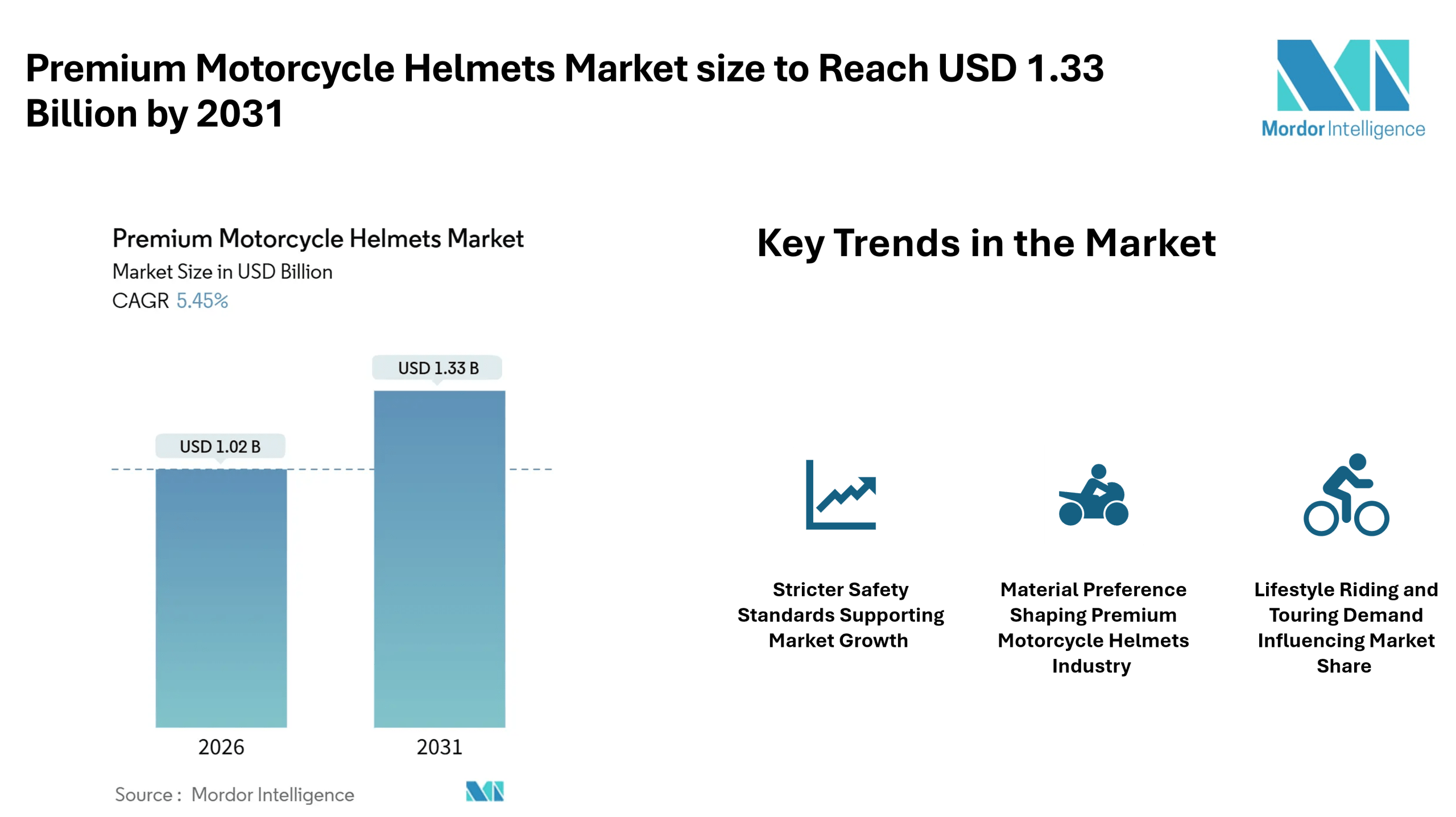 According to Mordor Intelligence, the premium motorcycle helmets market size was valued at USD 1.02 billion in 2026 and is forecast to reach USD 1.33 billion by 2031, reflecting consistent demand across commuter, touring, and performance riding categories. This premium motorcycle helmets market forecast is supported by stricter safety rules, growing motorcycle ownership in developing regions, and wider acceptance of helmets as long-term protective gear rather than a basic legal requirement.